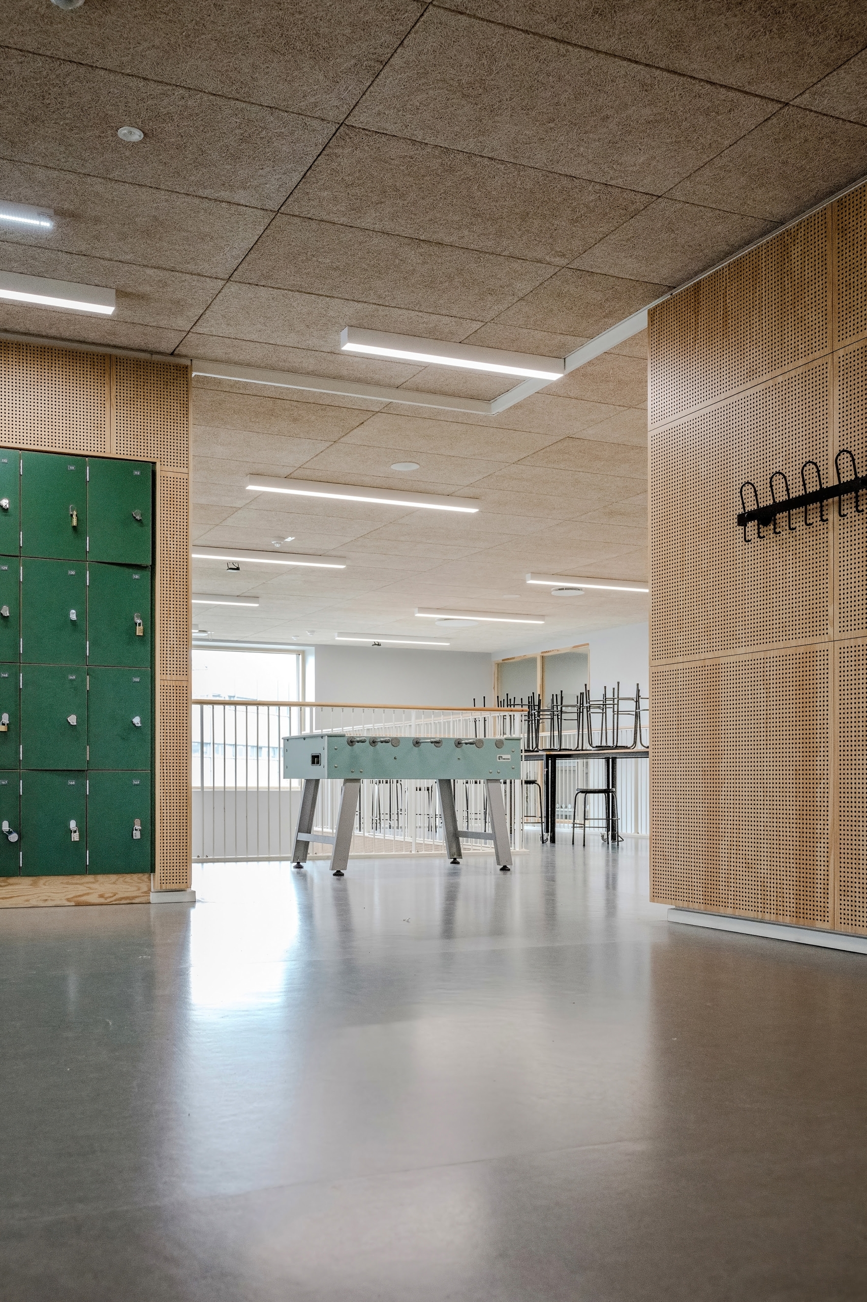 A projekt skandináv stílusban készült, ahol a meleg, természetes anyagok, mint például a fa, kontrasztot képeznek a keményebb, festett felületekkel. Az eredmény egy barátságos és harmonikus környezet, ahol az esztétika és az akusztika kéz a kézben jár, és a beltéri klíma támogatja a tanulást és a jó közérzetet.